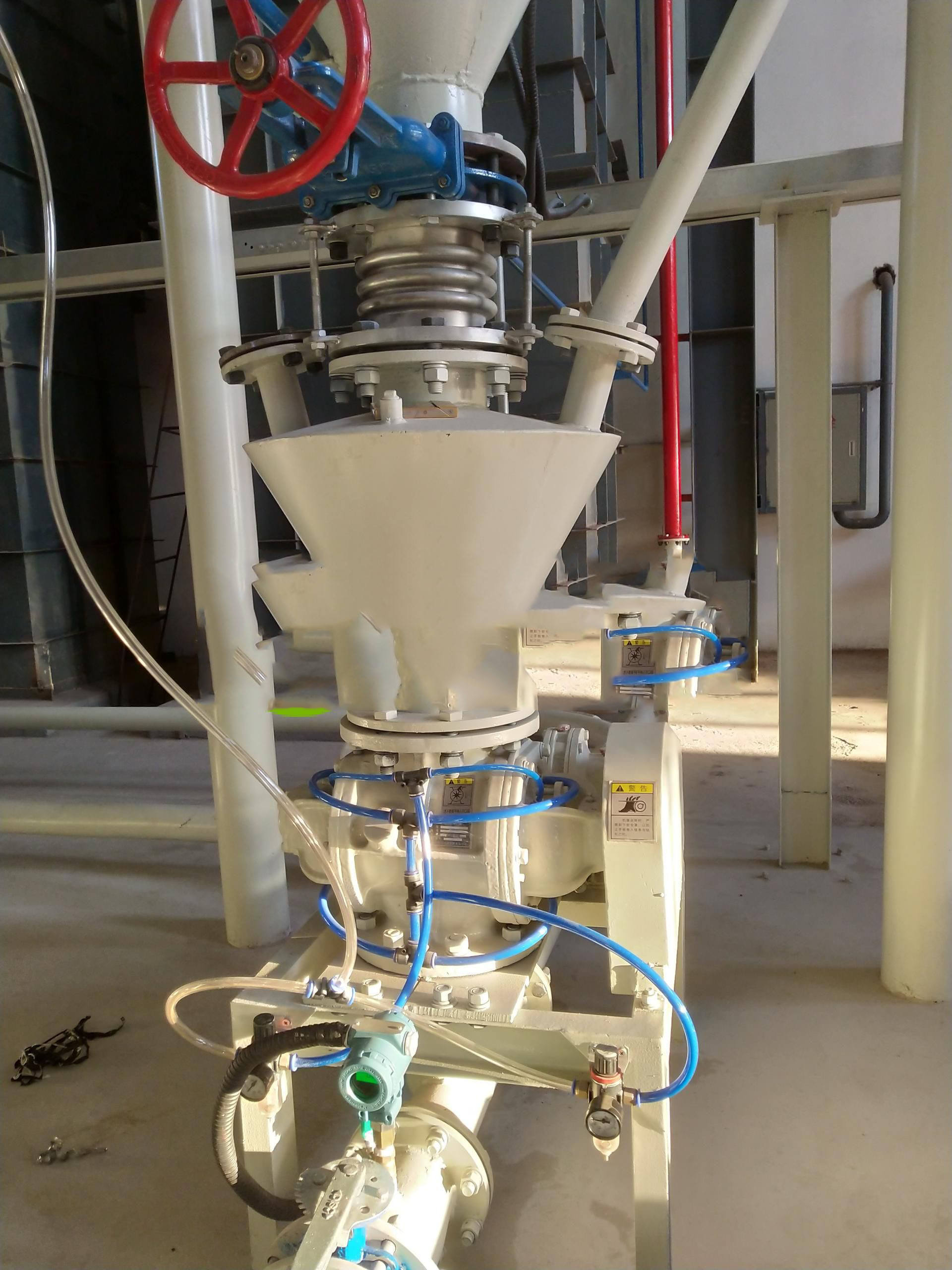 旋轉供料器的卸料量影響著氣力輸送的輸送量,在這個項目中我們甚至會通過旋轉供料器的減容來達到減少輸送量。