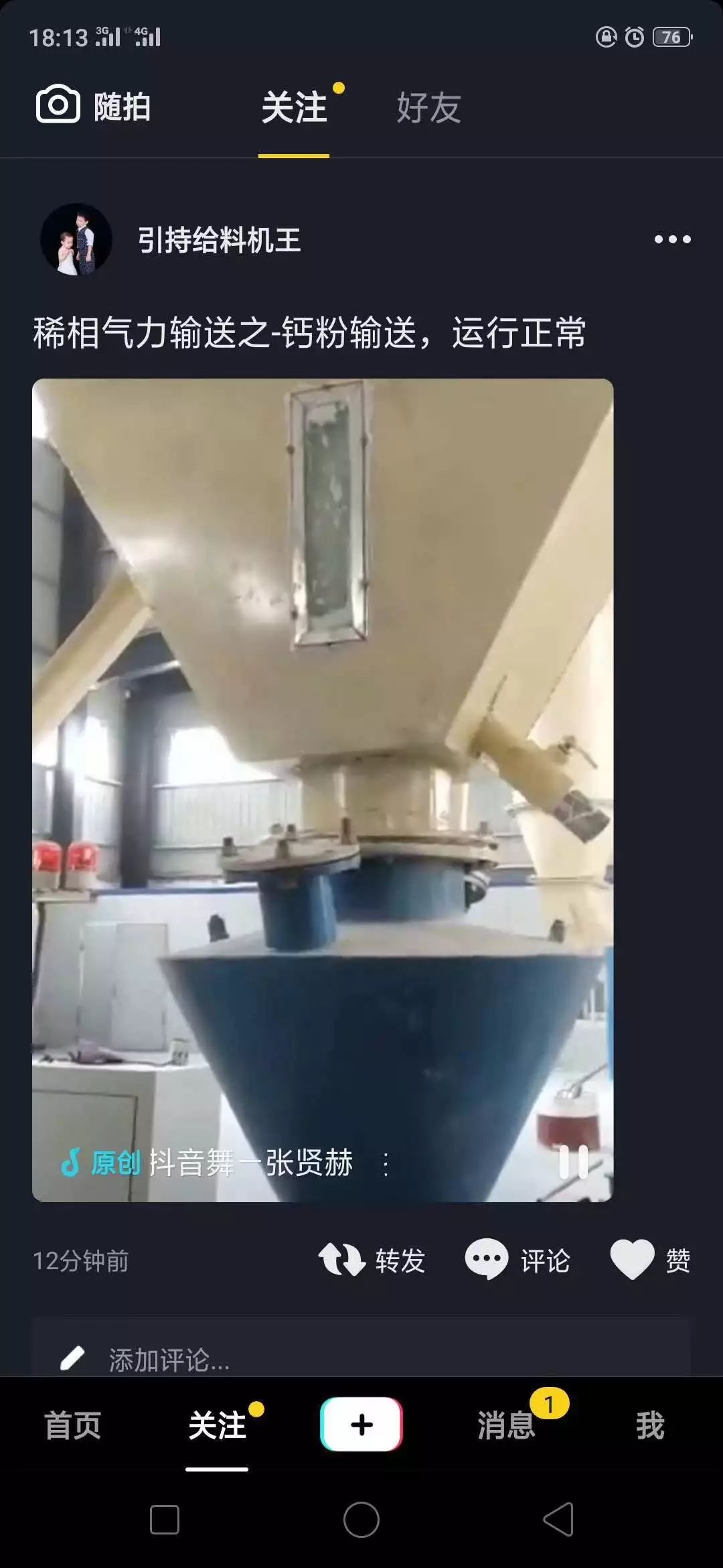 朋友圈配圖確為王經理在抖音發的一個濰坊的客戶反饋回來的視頻,輸送鈣粉的真實案例,運行正常,客戶表示滿意。