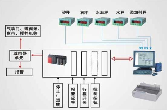 混凝土配料控制系統主要由一臺上位工業用PC,一臺下位PLC,若干臺稱量控制器以及現場器件組成。如下圖所示