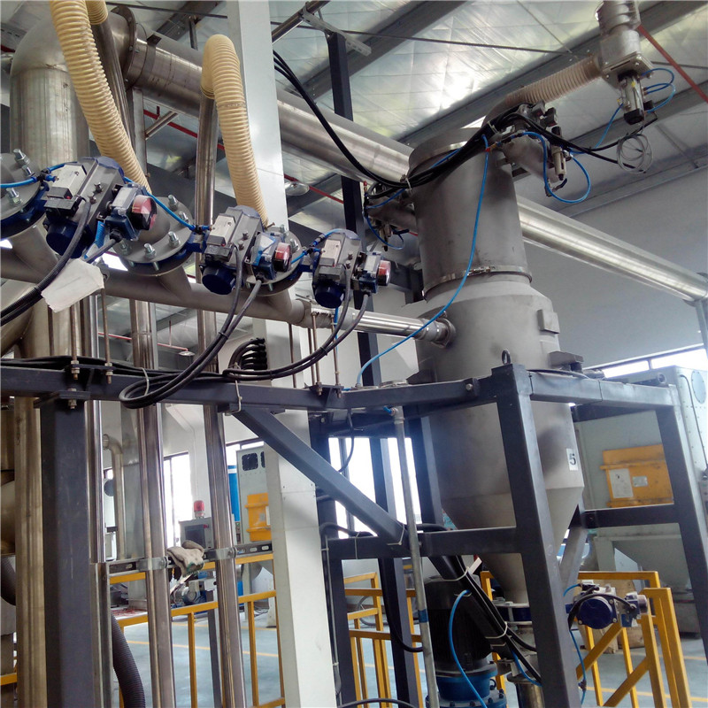 多組份吸料計量稱,主要由截氣閥、過濾器、進料閥組、稱重模塊、脈沖反沖裝置、卸料閥、儲料倉等組成。多組份吸料計量采用負壓平衡技術,通過真空負壓將物料吸到儲料倉內,在吸料的同時對物料進行計量,根據物料(粉末)的流動性,可增設破拱裝置以助流,可以最多20個管道同時接入該計量稱進行計量。精度:±200g或±3‰